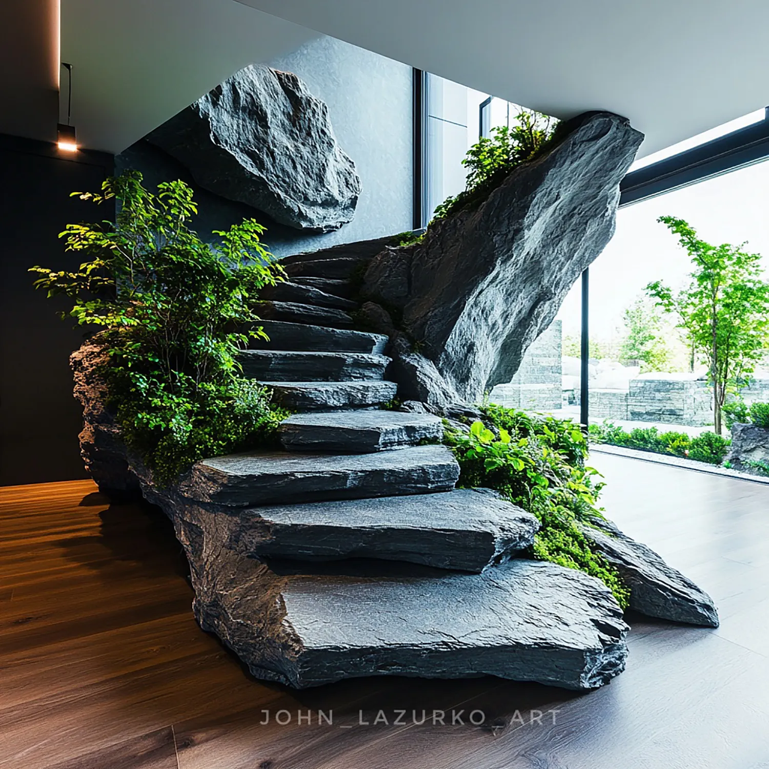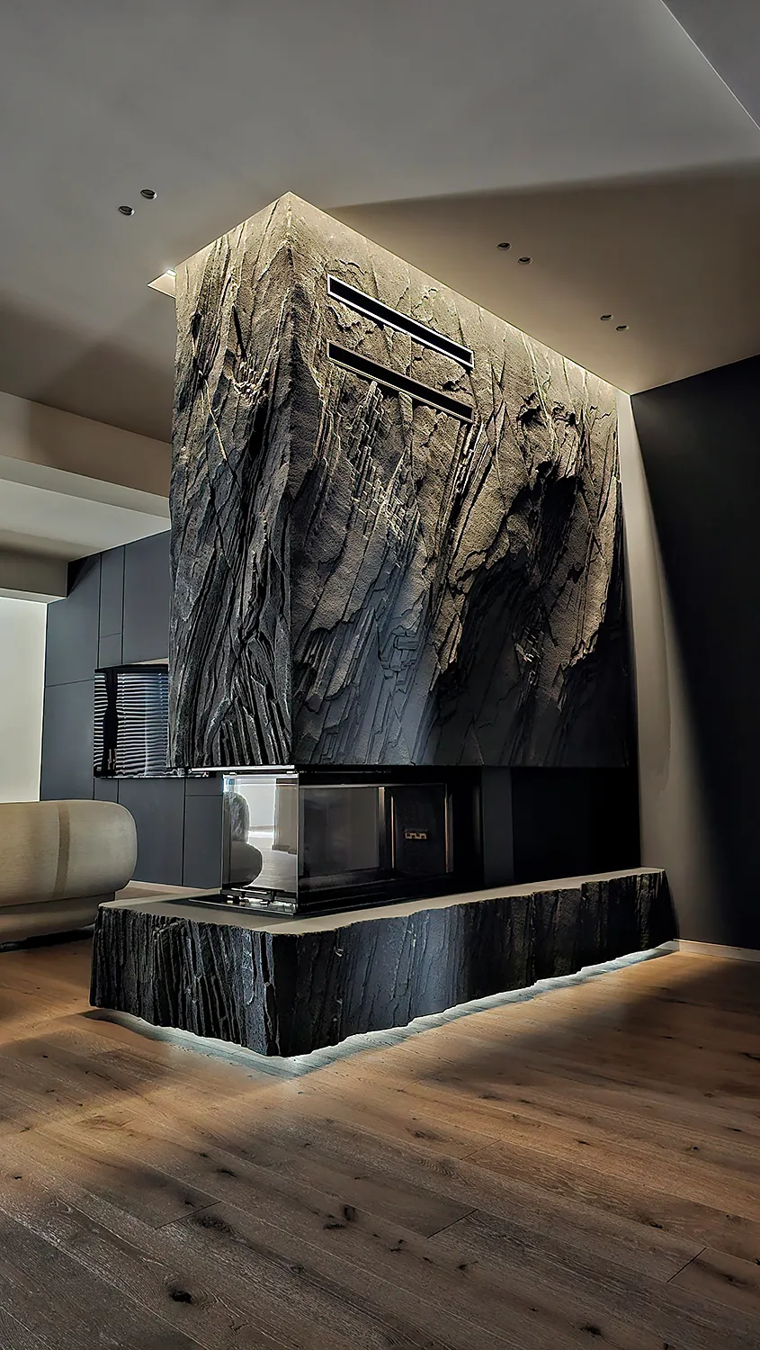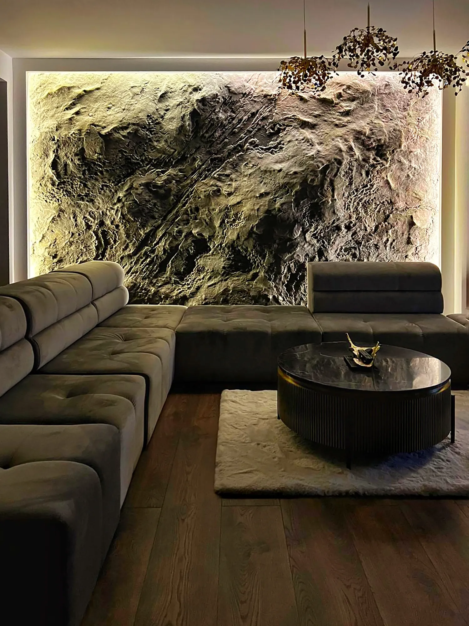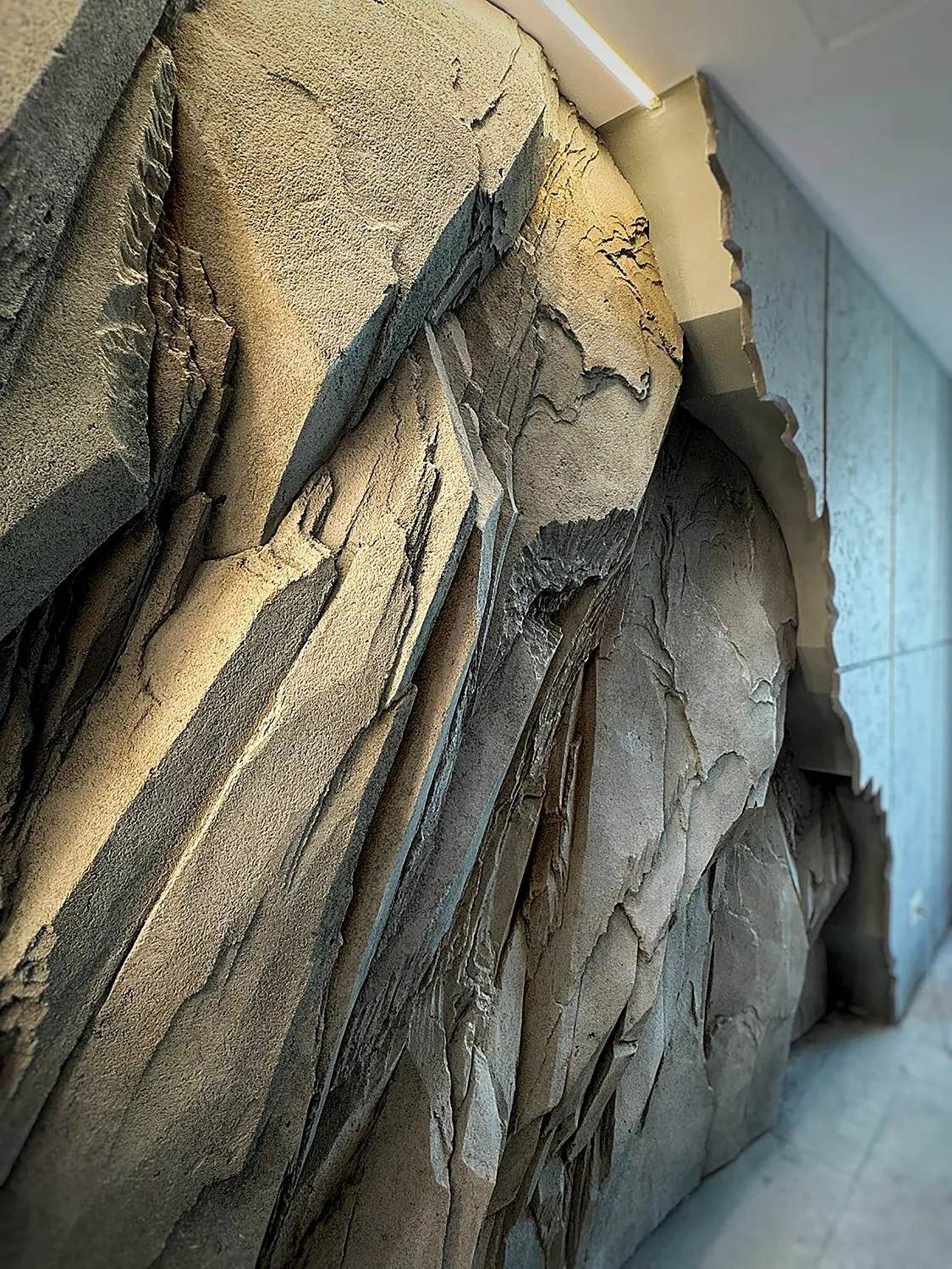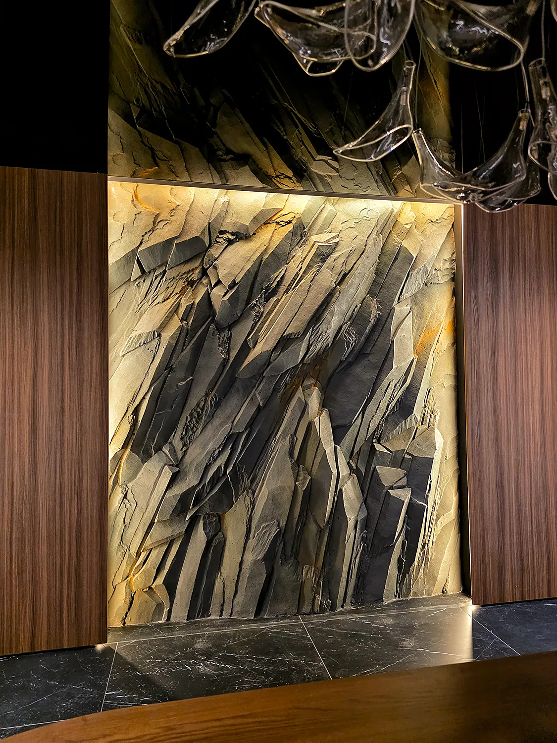 Besonders faszinierend ist Lazurkos Interpretation von Basaltformationen – jenen scharfkantigen, geometrischen Gesteinsstrukturen, die durch vulkanische Prozesse entstehen. Seine Werke spielen mit Licht und Schatten, erzeugen Tiefe und verleihen Räumen eine archaische Eleganz. In luxuriösen Innenräumen setzt er diese Technik für dramatische Wandverkleidungen, Kamine oder Treppenaufgänge ein. In der Außenarchitektur entstehen Hauseingänge, die wie aus einer natürlichen Felswand gehauen wirken. Seine Kunst verbindet die rohe Kraft der Natur mit moderner Architektur, wobei die Grenzen zwischen Design und Skulptur zunehmend verschwimmen.