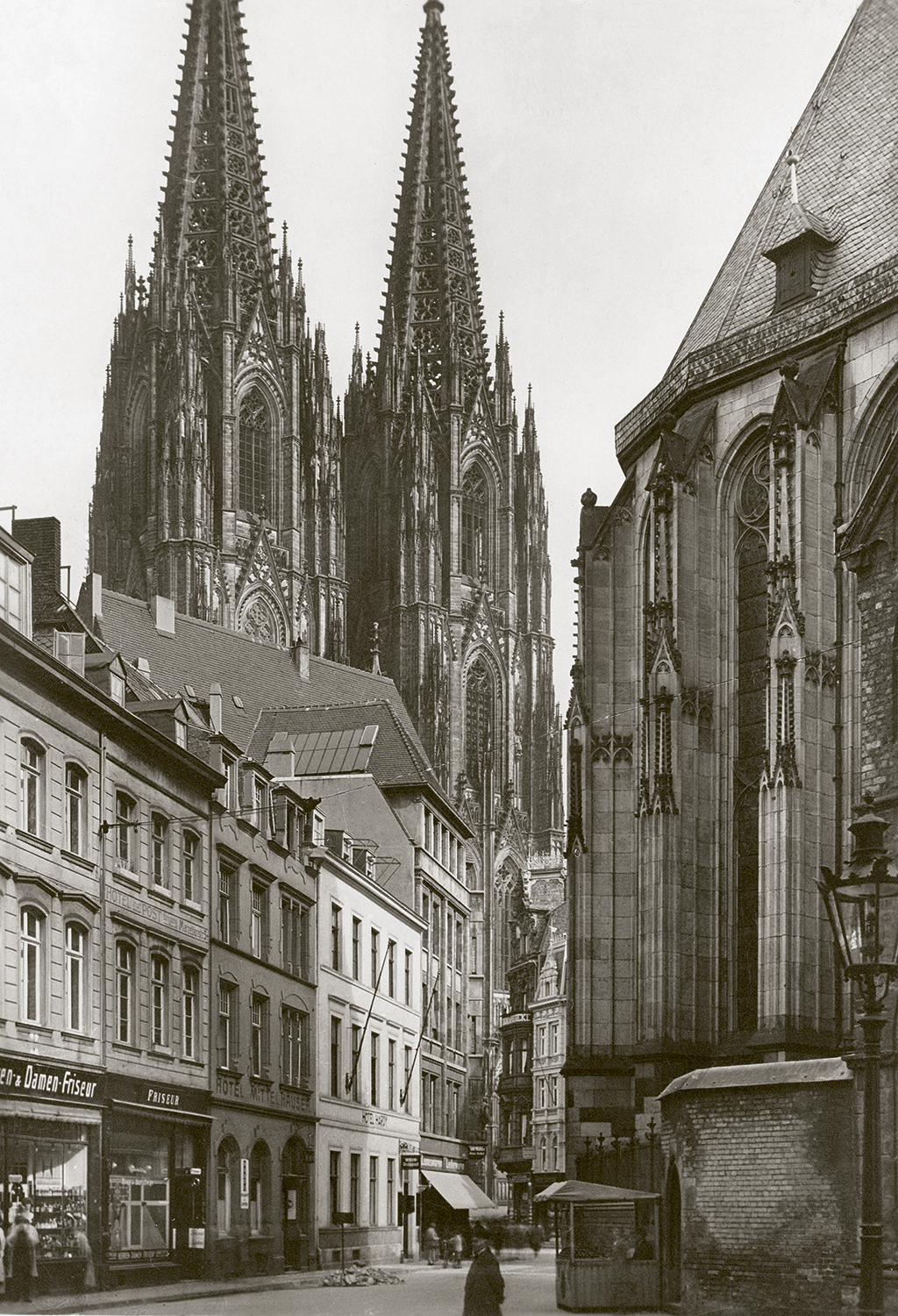 Coubilliers Blick auf Köln in den 1920er Jahren zeigt eine Stadt im Wandel – zwischen mittelalterlicher Enge und industrieller Moderne. Neue Bauten wie das Hansahochhaus fotografierte er nicht als Sensation, sondern als Teil einer wachsenden Struktur. Historisches und Zeitgenössisches stehen gleichberechtigt nebeneinander. Die Bildausschnitte wirken durchdacht, aber nie konstruiert. Statt Bedeutungen zu setzen, lässt Coubillier die Dinge für sich sprechen. So entsteht ein visuelles Protokoll der Urbanität, das sich der großen Geste entzieht und doch eine Stadt in Bewegung zeigt.