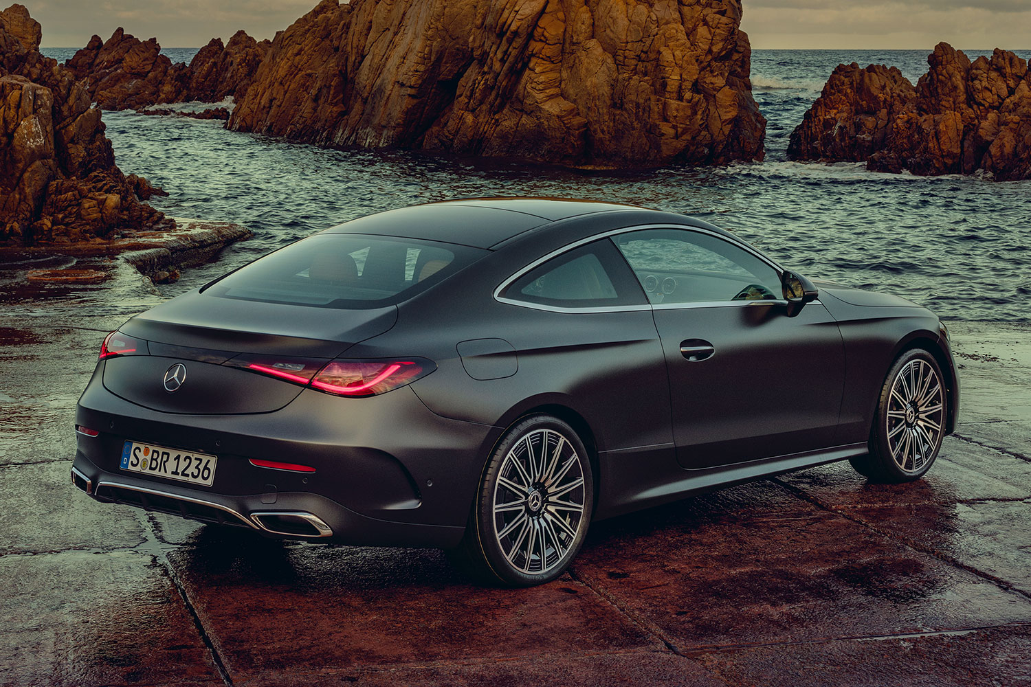 Das CLE Coupé beeindruckt mit seiner nach vorne geneigten “Shark Nose”-Frontpartie, tiefgezogenen LED-Scheinwerfern und einem markanten dreidimensionalen Kühlergrill. Die langgestreckte Motorhaube mit stark konturierten Powerdomes verweist auf die leistungsstarken Triebwerke. Das muskulöse Heck überzeugt mit fließenden Flächen und modernen LED-Leuchten.
