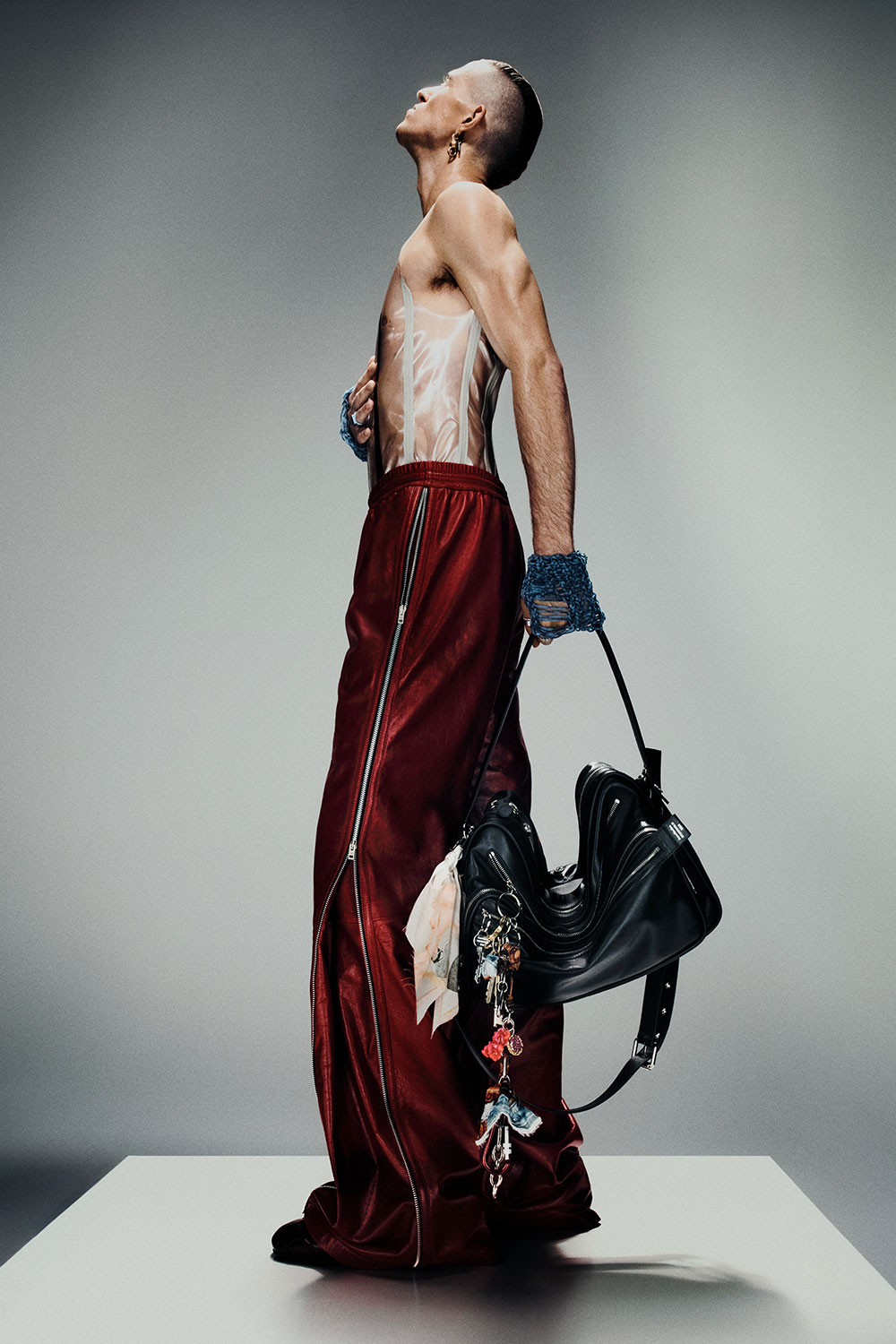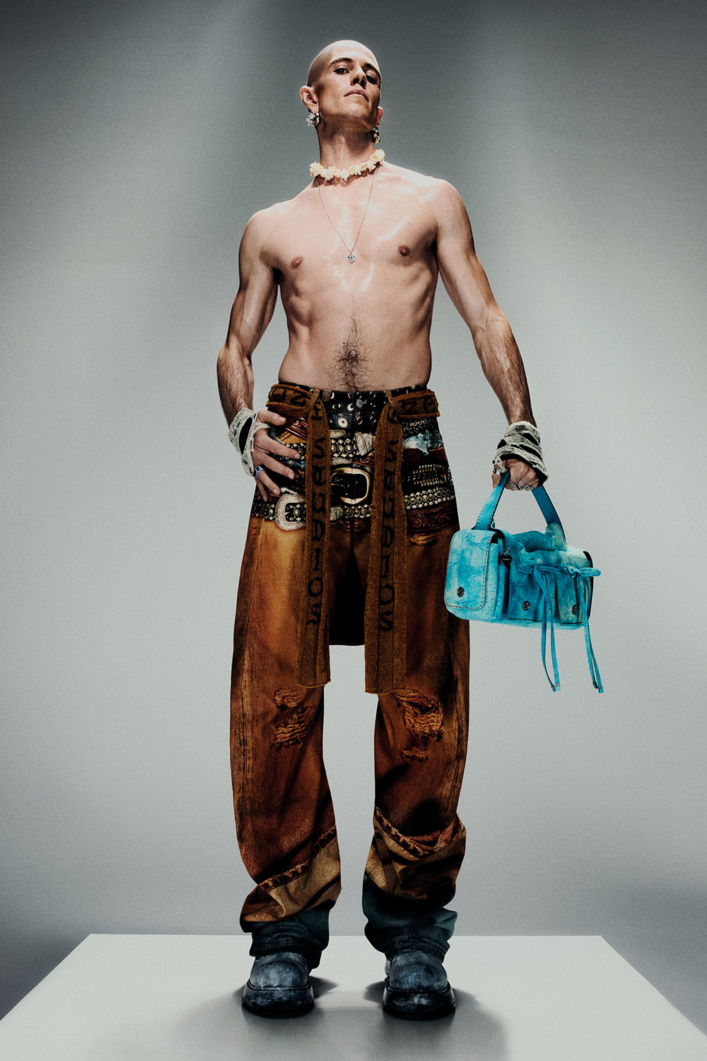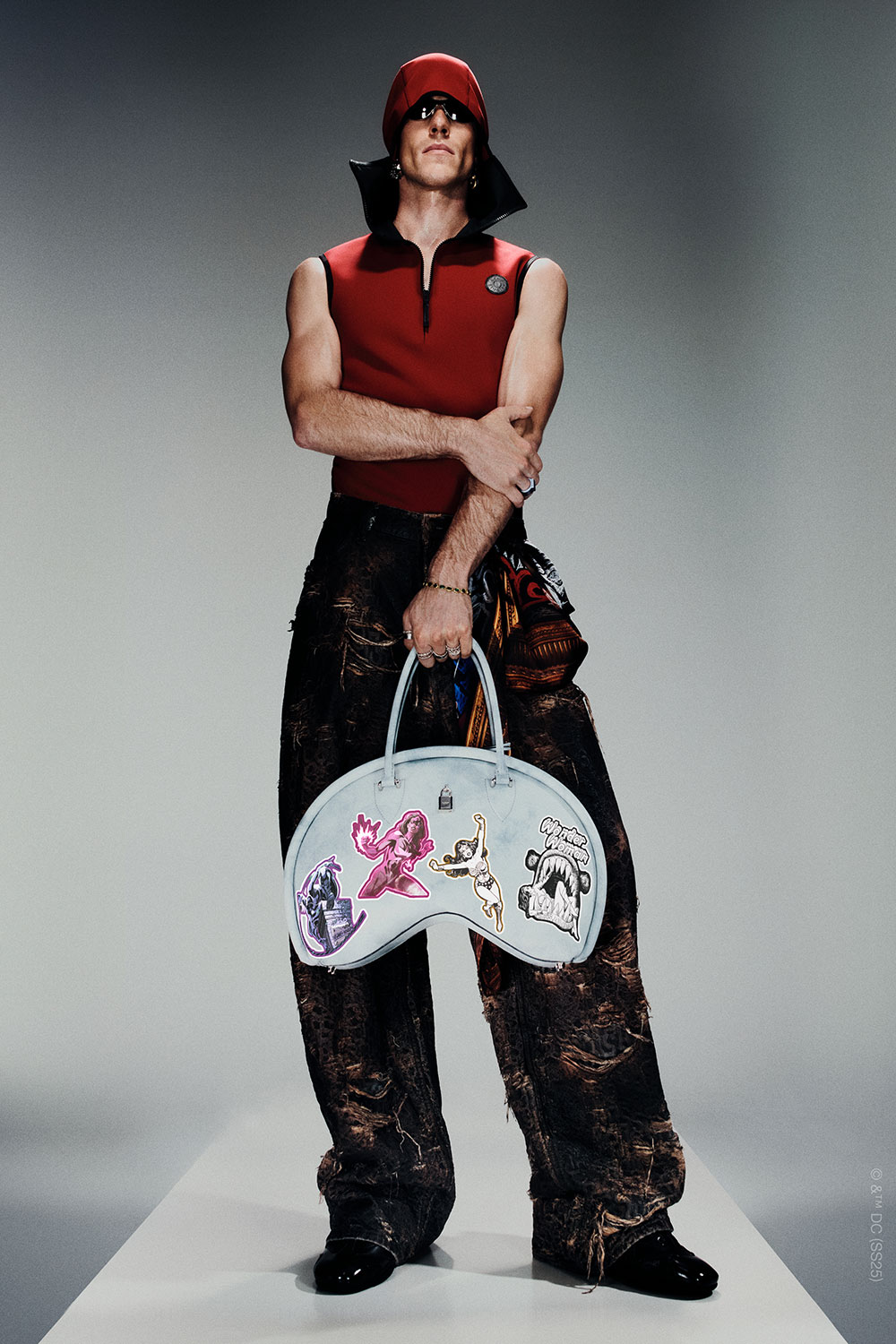 Although it’s menswear, pop culture femme fatales such as DC’s Wonderwoman, the Huntress, the Drowned Woman and Catwoman feature throughout the collection, with contrasting elements that make each outfit oscillate between age-appropriate attire and unapologetic self-expression. Accessories and shoes reinforce the styling by exploring different extremes. These include a new bag inspired by camera bags, the multi-pocket bag with a used look, the Bowlina bag with stickers and a large selection of boots with metal embellishments and chunky shoes.