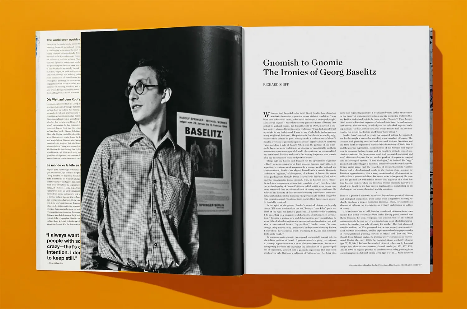 Baselitz non appartiene a nessuna scuola, né ne fonda una. La sua arte rimane un solitario, nato da esperienze personali e rotture storiche. Due esperienze della sua infanzia lo hanno plasmato: la scoperta di urne slave nel terreno del suo villaggio natale, che ha scosso la sua identità tedesca, e l’osservazione di un ragazzo che si mordeva il braccio mentre parlava – un feedback fisico di sentimenti e linguaggio. Forse è proprio questa la forza dell’opera di Baselitz: non pensa all’arte, sente con essa. La monografia non sta ferma, ma sente la sua strada – come l’opera stessa, che dice di più sulle sue origini in ogni frammento che in ogni spiegazione.